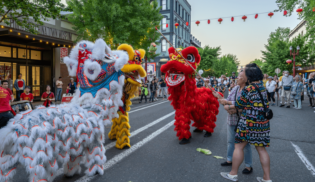 華埠歷史博物館董事會副主席Sarah Chung,秘書Tracie Quan共同為醒獅採青。