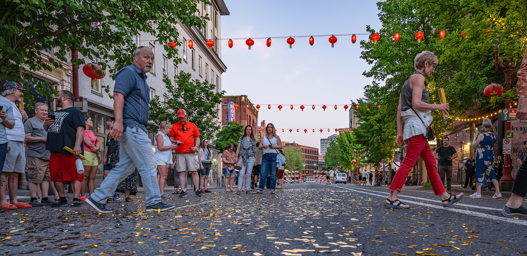 在十秒倒計時開始後的晚八點三十分整,高高懸掛的一串串大紅燈籠同時點亮,數十隻彩色紙花炮一起綻放,隨著掌聲和歡呼聲,金色的紙片漫天飛舞,場面熱烈。