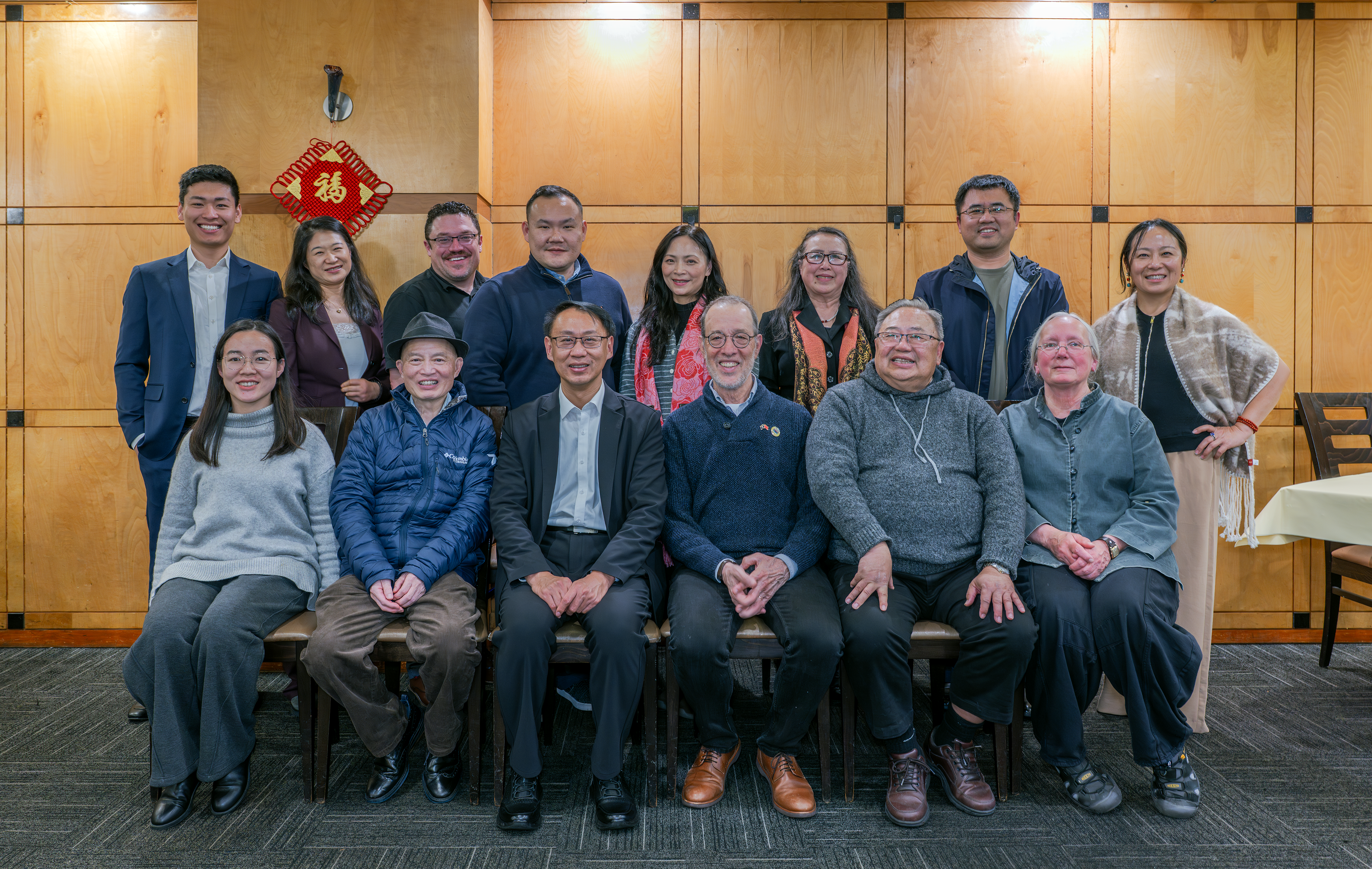 前排左起:中國友協美大部孫亞靜、俄州中國友好省州委員會主任藍進、美大部主任孫濤、前州參議員德蒙布羅、俄勒岡中國理事會聯合主席應書琪、財務主管羅賓,美大部美國處處長王凱(後排右二)等與俄勒岡中國理事會部分成員等合影