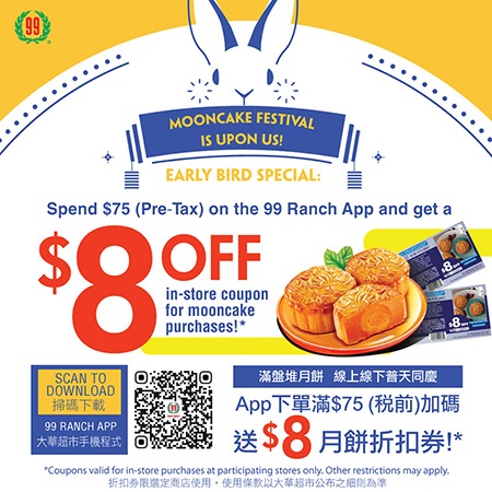 另外,99大華亦舉辦買月餅優惠活動。凡在8/20 – 9/2在大華超市App上購買滿$75,就送您$8月餅折扣券!要獲得折扣,立即掃描二維碼下載大華超市App!