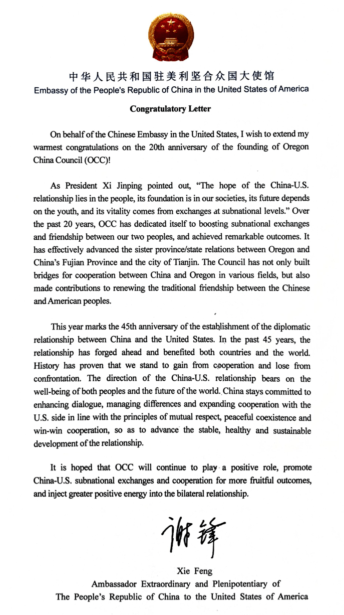 謝峰大使在賀信中指出,二十年來,俄勒岡中國理事會致力於促進中美地方交流、增進兩國人民之間的友誼,取得了令人矚目的成果。理事會不僅為中國與俄勒岡州各領域的合作搭建橋樑,更有效地推進了俄勒岡州與福建、俄勒岡與天津持續深入地友好往來,為延續中美傳統友誼作出了積極貢獻。