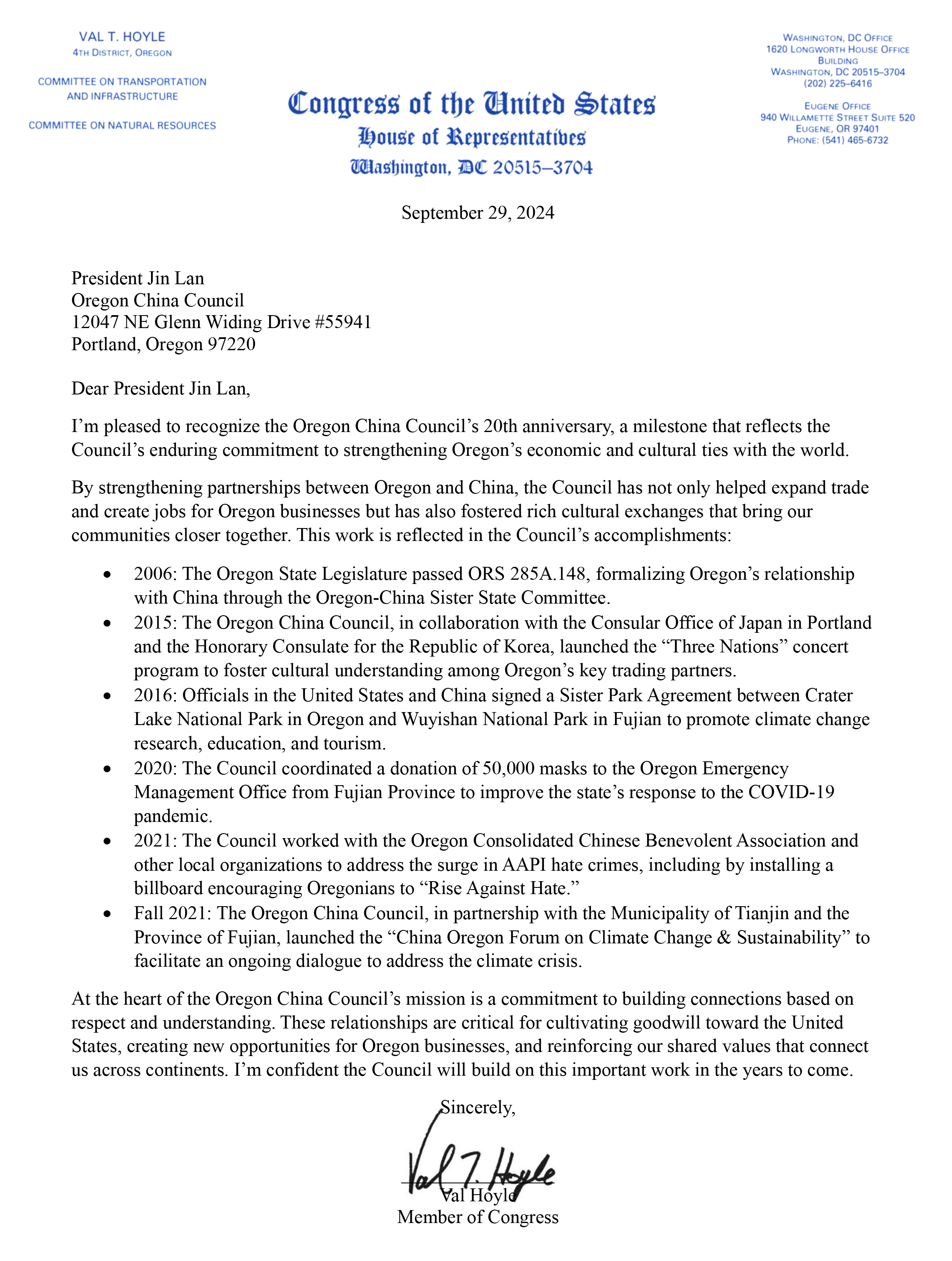 聯邦眾議員瓦爾·霍伊爾在賀信中寫道,透過增進俄勒岡與中國之間的夥伴關係,該理事會不僅幫助俄勒岡擴大了與中國的貿易,並為俄勒岡州企業創造就業機會,同時也促進了豐富的文化交流,使我們的社區更加緊密地聯繫在一起。