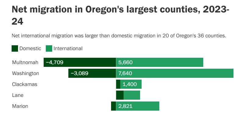 去年,國際移民為俄勒岡增加了近2萬4,000名新居民。相比之下,從美國其他州搬來的人數不但無法抵銷流失,反而還有1,200人淨流出,也就是說,搬離俄勒岡的人比搬進來的更多。