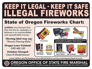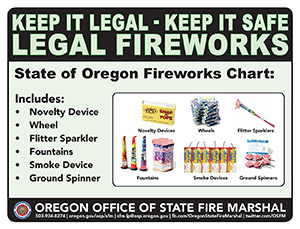 俄勒岡州消防局長表示,所有人士均有責任小心燃放合法的煙火,同時亦要考慮到鄰居的小孩和寵物的安全。所有在本州燃放的煙火必需是在本州購來的。