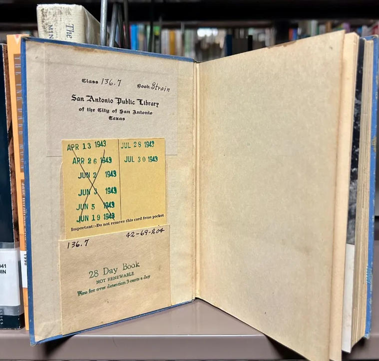 這本書名為Your Child, His Family, and Friends(《你的孩子、他的家庭與朋友》),內容是指導父母如何幫助孩子處理家庭與人際關係。聖安東尼奧公共圖書館表示,這本書最初於1943年7月被借出,直至今年6月才從俄勒岡寄回。