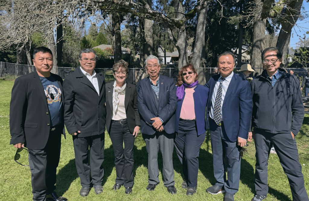 左起:全美華人聯合商會監事長秦春兵、美國華人聯盟全美理事暨華盛頓州華人聯盟董事會主席黎觀城、塞勒姆市長茱莉、萃勝工商會元老溫紹廉、塞勒姆市府歷史文化專員金伯利、海宴公所元老林和優、嘉賓代表李廣信,於祭祀儀式上合影