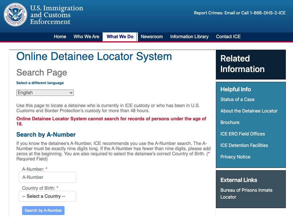 • 請準備好被拘留者的全名、出生日期、原籍國及外國人號碼(A number)
