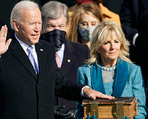 拜登在最高法院首席大法官羅伯茨監誓下成為總統,會場隨即演奏《向統帥致敬》(Hail to the Chief)。