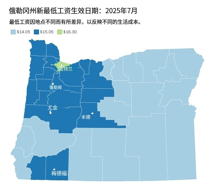 由於俄勒岡州生活成本差異明顯,最低工資依地區劃分為三個層級: