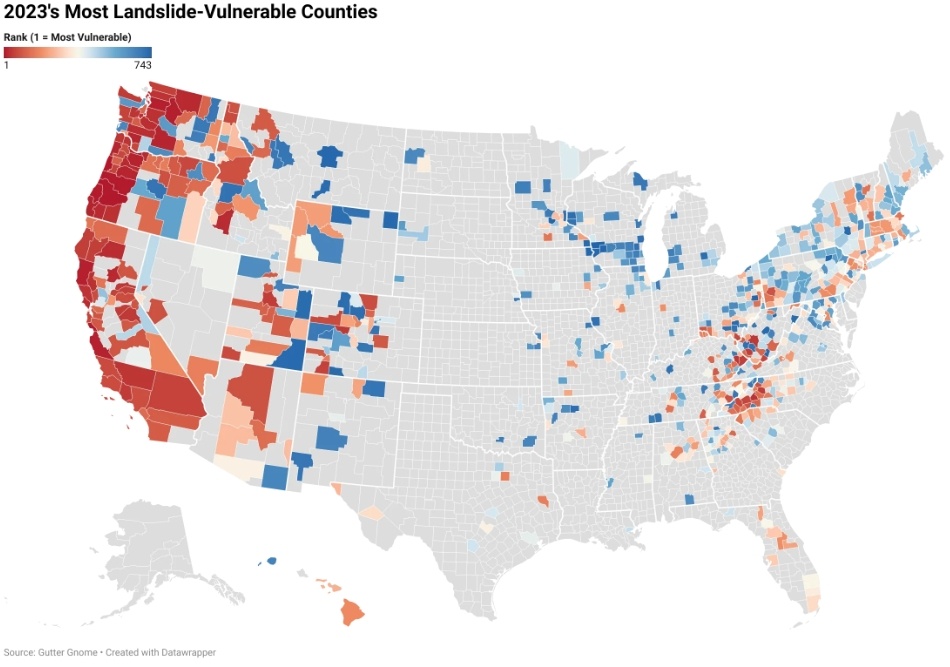 風險排名前20的市縣,全部位於俄勒岡、華盛頓和加利福尼亞三州,凸顯了太平洋西北地區面臨的整體山崩威脅這三個州的多個縣市都預計因山崩損害而每年損失數百萬美元。