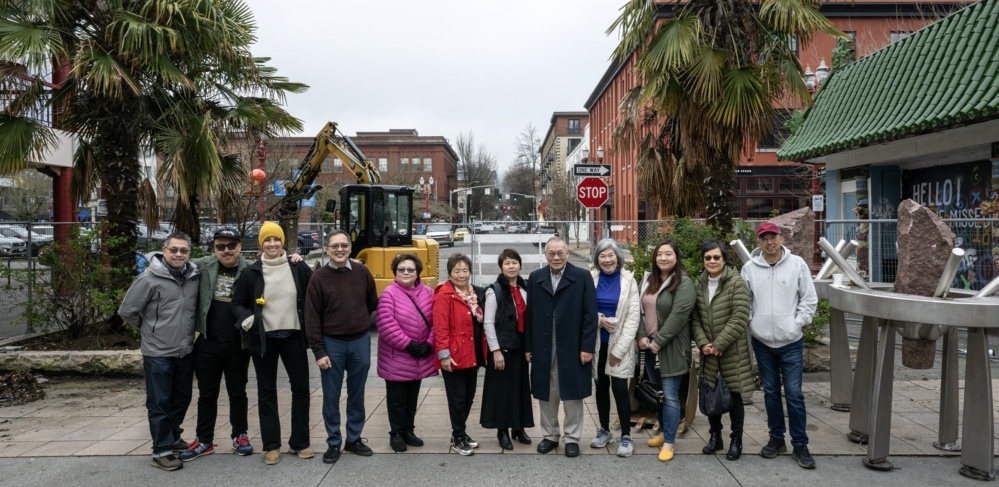 俄勒岡華人聯盟兆洪成、波特蘭新聞社長Rosaline、蘭蘇園文化與社區關係部副主任孫韻芝、蘭蘇園前總監Gloria Lee,以及中華會館主席廖懷澤,中華會館副主席李汝堯、老城社區協會主席Jessie Burke等在動工儀式上合影
