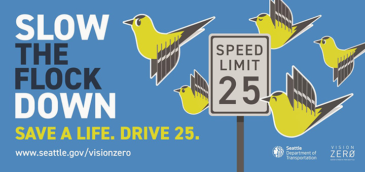 西雅圖市政府在官網上特別指出:「超速並不是開玩笑。恰好相反,速度是碰撞頻率和嚴重程度的首要 因素。您的駕駛速度會影響您的視野、您的反應速度以及您完全停下來所需的時間。走得越快,對你自己和你周圍的人造成的傷害就越大——尤其是那些走路或騎自行車的人。雖然慢速行駛可能看起來很不方便,但當您進行數學計算時,大多數行程只需20-40 秒即可以25英里/小時的速度行駛一英里,而不是在不太安全的速度下行駛。如果在您的行程中增加幾分鍾意味著避免導致嚴重傷害或死亡的撞車事故,那就再好不過了。我們感謝司機大聲疾呼並對安全做出集體承諾。」
