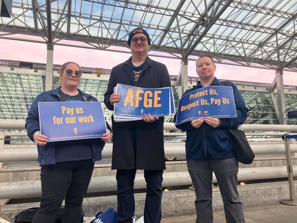 當天上午,隸屬美國政府雇員聯合會第1127分會的數名成員,站在機場出發區道路中央分隔帶,高舉「保護我們、尊重我們、支付我們薪資」等標語,試圖讓往來旅客關注政府停擺對基層員工的影響。