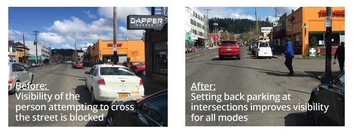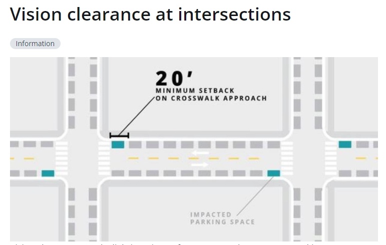 根據俄勒岡州交通法規(ORS811.550第17條),車輛不得停放在人行橫道20英尺(約6米)內,為波特蘭推行「路口禁停」提供了法律依據。