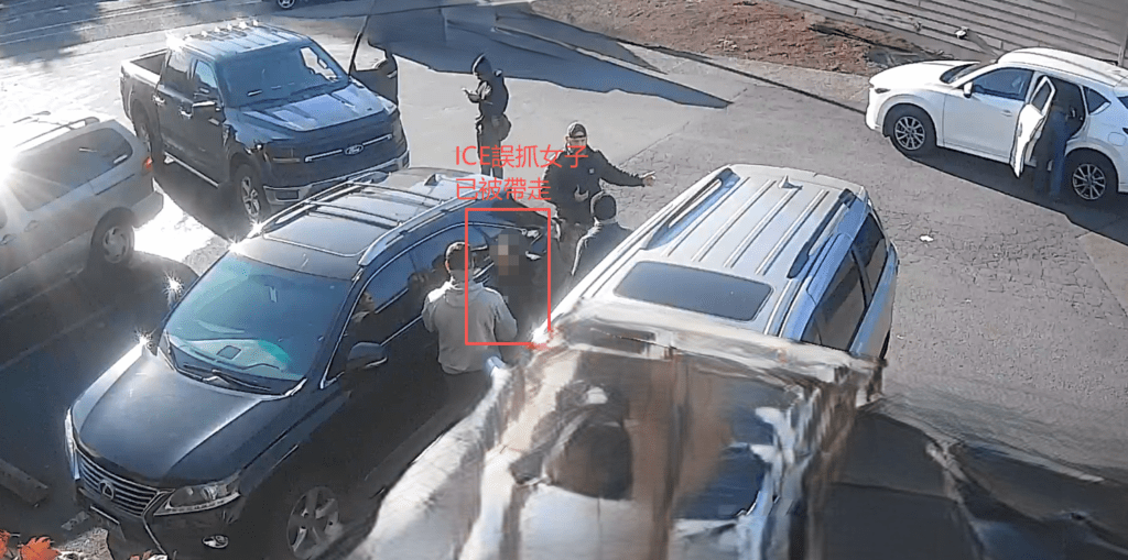 畫面中,一名華人女子駕車準備外出時,似乎察覺到後方有可疑車輛跟蹤,立即將車倒回停車位。就在她剛下車的瞬間,多名ICE人員從車內衝出,直接將她拘捕。根據知情人士說法,這名女子並非ICE此行真正要找的人,但因她本身屬於逾期居留身分,因此仍被當場帶走。影片中段,另一名女子提著兩袋垃圾走出家門。她遠遠看到ICE人員後,立刻停下、轉頭返回住處。
