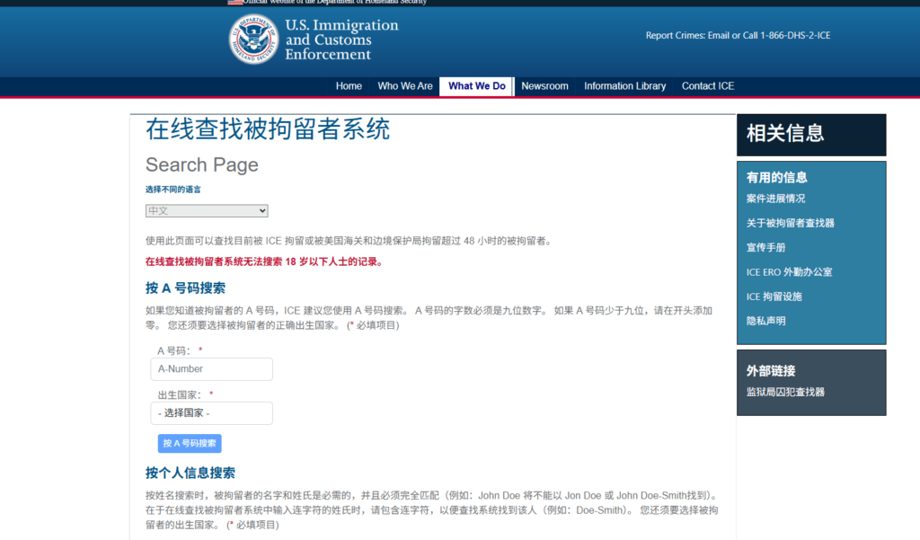 若家人或朋友突然失聯、具備被拘捕風險,可使用ICE的線上在押人員查詢系統 https://locator.ice.gov/odls/#/search。通常需至少24小時後資訊才會被錄入系統。