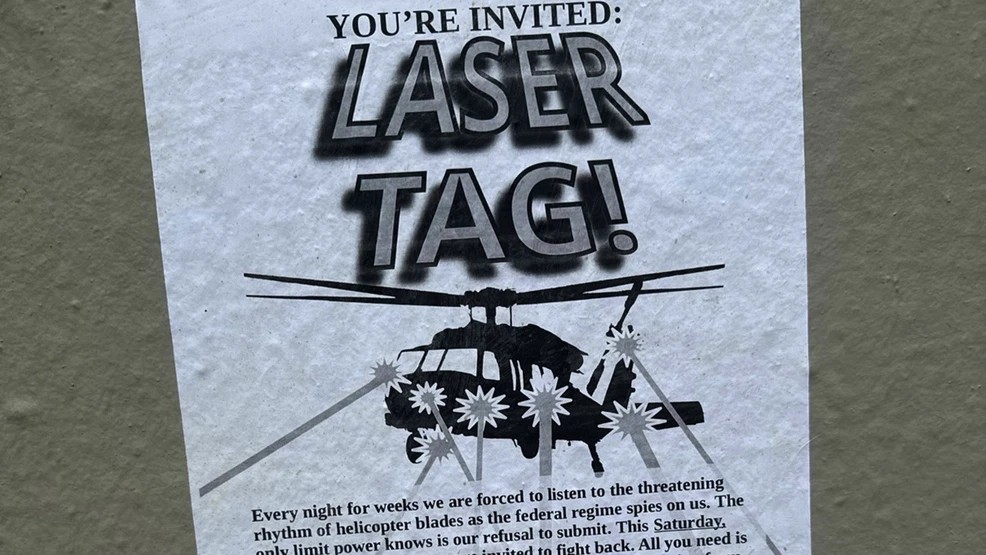 這張傳單來自一個自稱為「波特蘭無政府反情報平台」的匿名海報,內容鼓動民眾以雷射照射直升機,並以激烈措辭指控「每晚數週我們都被直升機旋翼的威脅性節奏迫聽,聯邦政權以此監視我們」,傳單呼籲以「雷射筆」干擾政府直升機。美國法律將朝飛機或直升機照射雷射視為聯邦重罪。