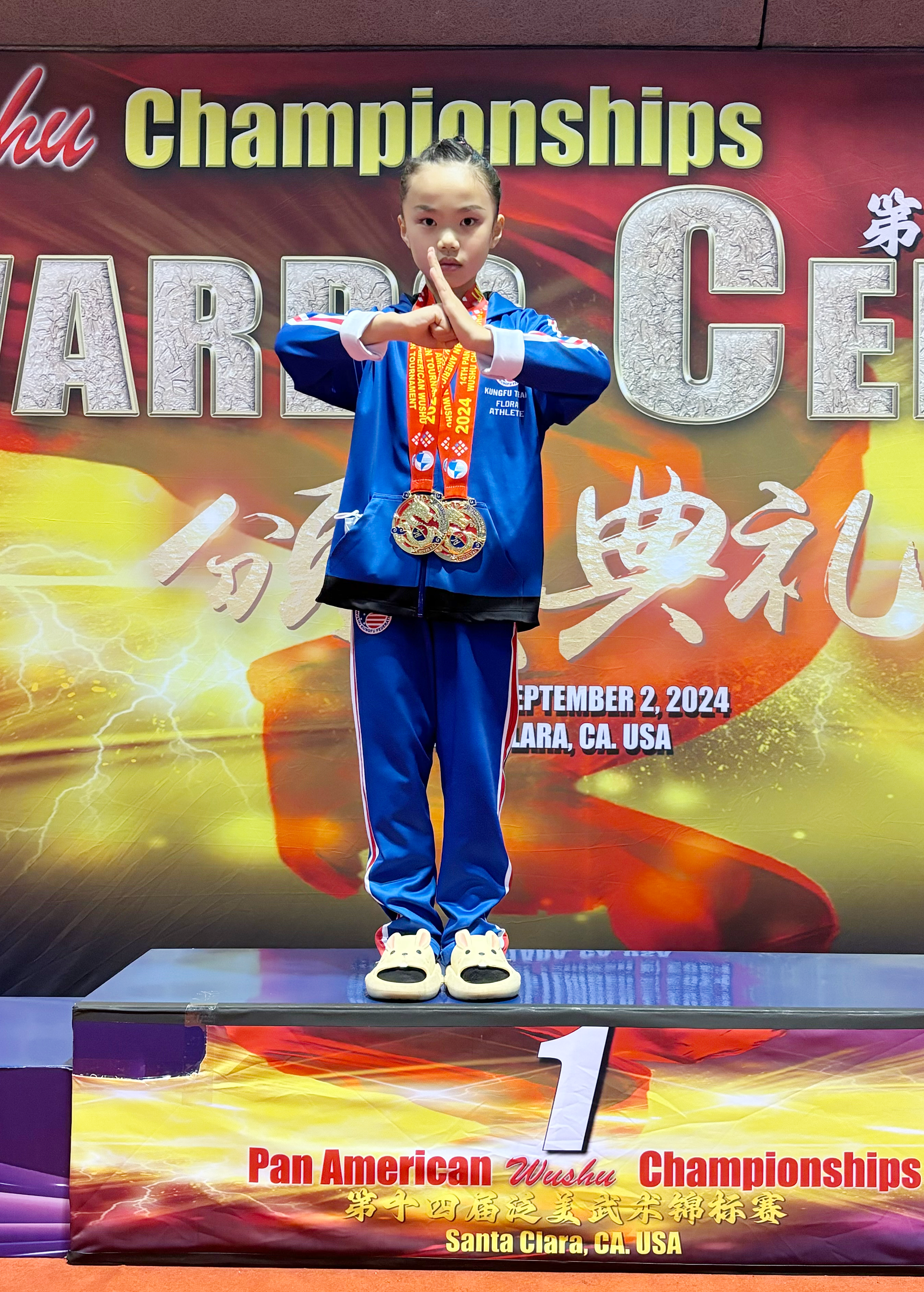 在強手如林的賽場上,美國武術中心的小將們個個信心滿滿、沈著應戰,發揮出了平時訓練的最高水準,一招一式都表現得非常出色,贏得了評委們的高度讚賞,每位參賽選手都有金牌攬入懷中。本屆賽事上小將們共獲得了金牌37枚、銀牌8枚,以及2枚銅牌。其中Kaden Wong;Phylicia Shew;Mariella Brayton 各獲得5枚金牌,Samantha Lu;Emma Huang;Albert Liu 各獲得4枚金牌。