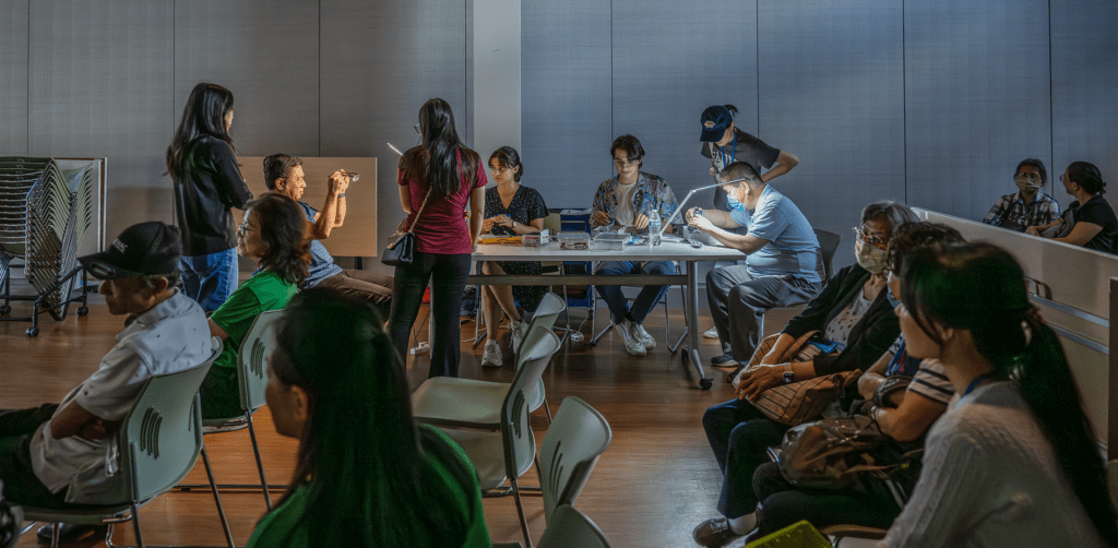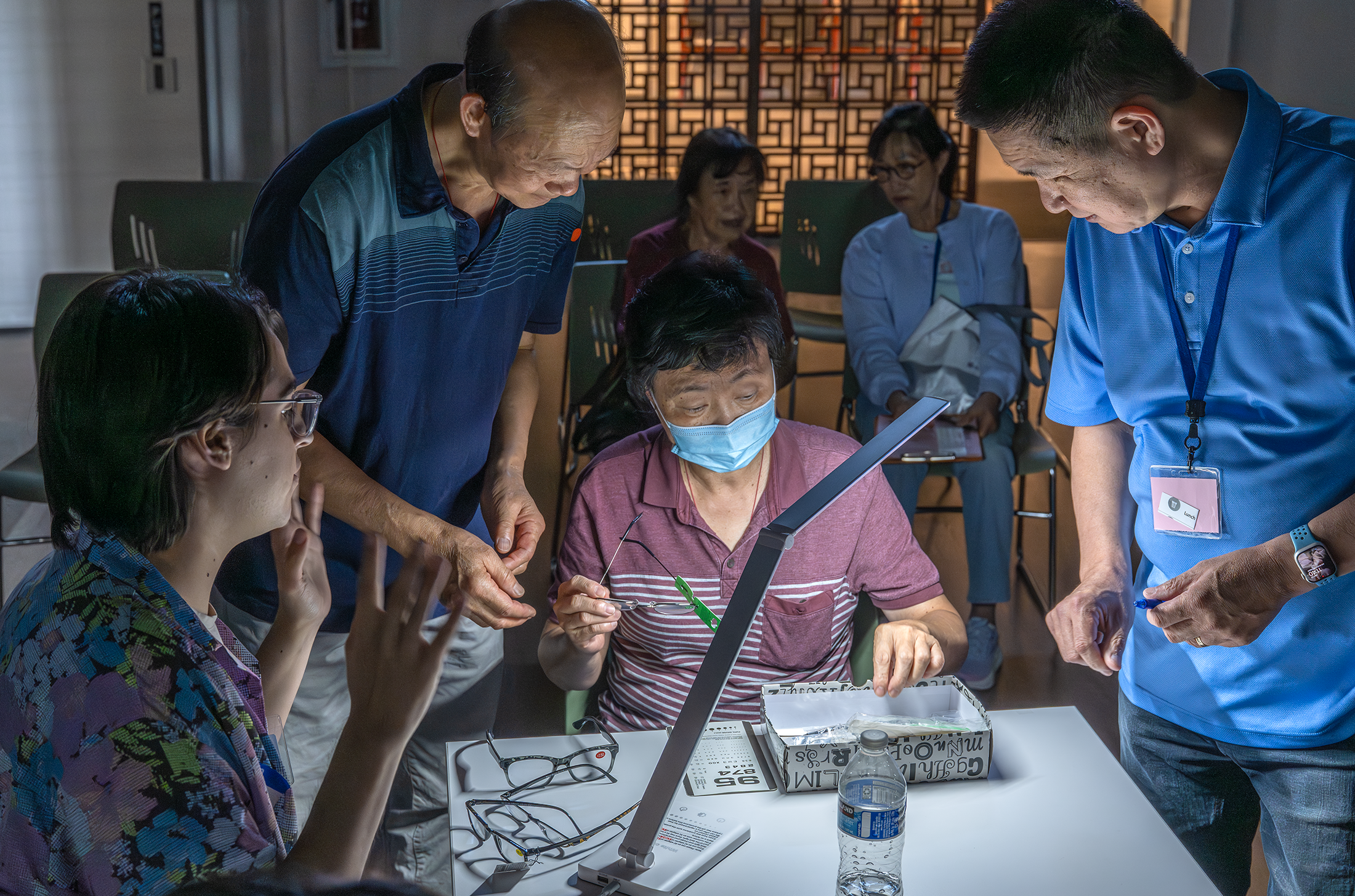 大廳內等候檢查的民眾和接受檢測後挑選眼鏡的兩位長者