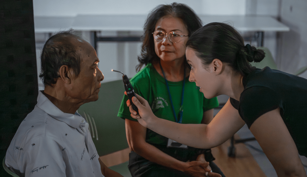 醫務人員對一位長者做眼睛晶體、結膜等方面的檢查