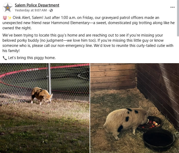 薩冷警察局在臉書上發文寫道:「Oink Alert, Salem!凌晨1點剛過,我們的夜班巡警在哈蒙德小學附近遇到一位新朋友,一頭可愛的家豬,邁著自信步伐,好像整個夜晚都是牠的!」警方笑稱,這隻「捲尾巴的小傢伙」看起來完全不慌不忙,「我們一直努力想找到牠的家人,也想問問是不是有人丟了你心愛的豬豬夥伴?(不會笑你,我們也愛牠)」