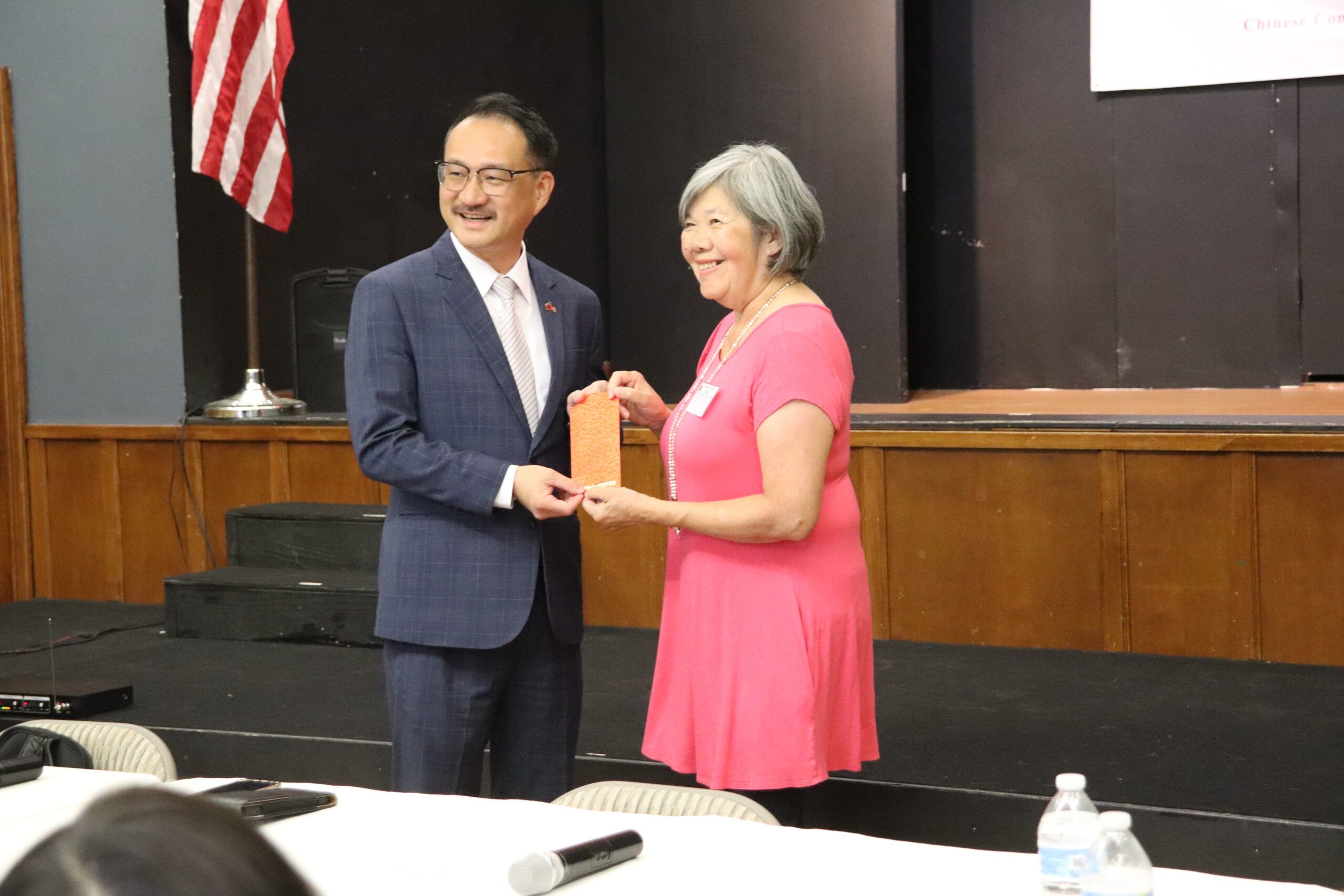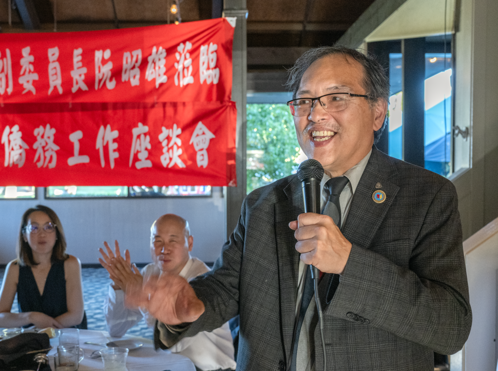 砵崙中華會館主席李汝堯致歡迎詞,他希望在阮副委員長的帶領、協助及溝通下,能夠持續支持本地僑社,促進波特蘭社區僑務工作的發展。」