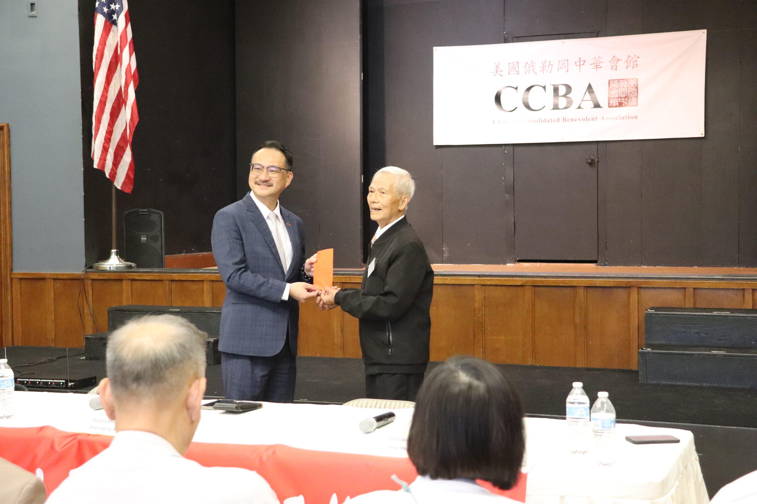 歡迎會上,阮昭雄向與會的砵崙中華會館、同源會、秉公堂、粵聲社等多個僑團派發紅包,以示對本地僑務工作的支持。