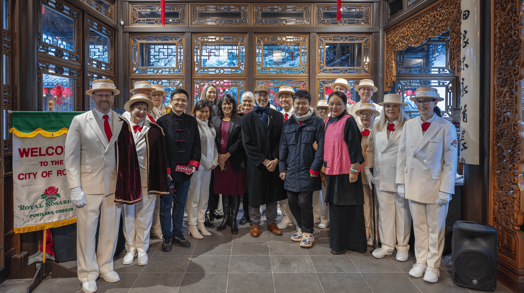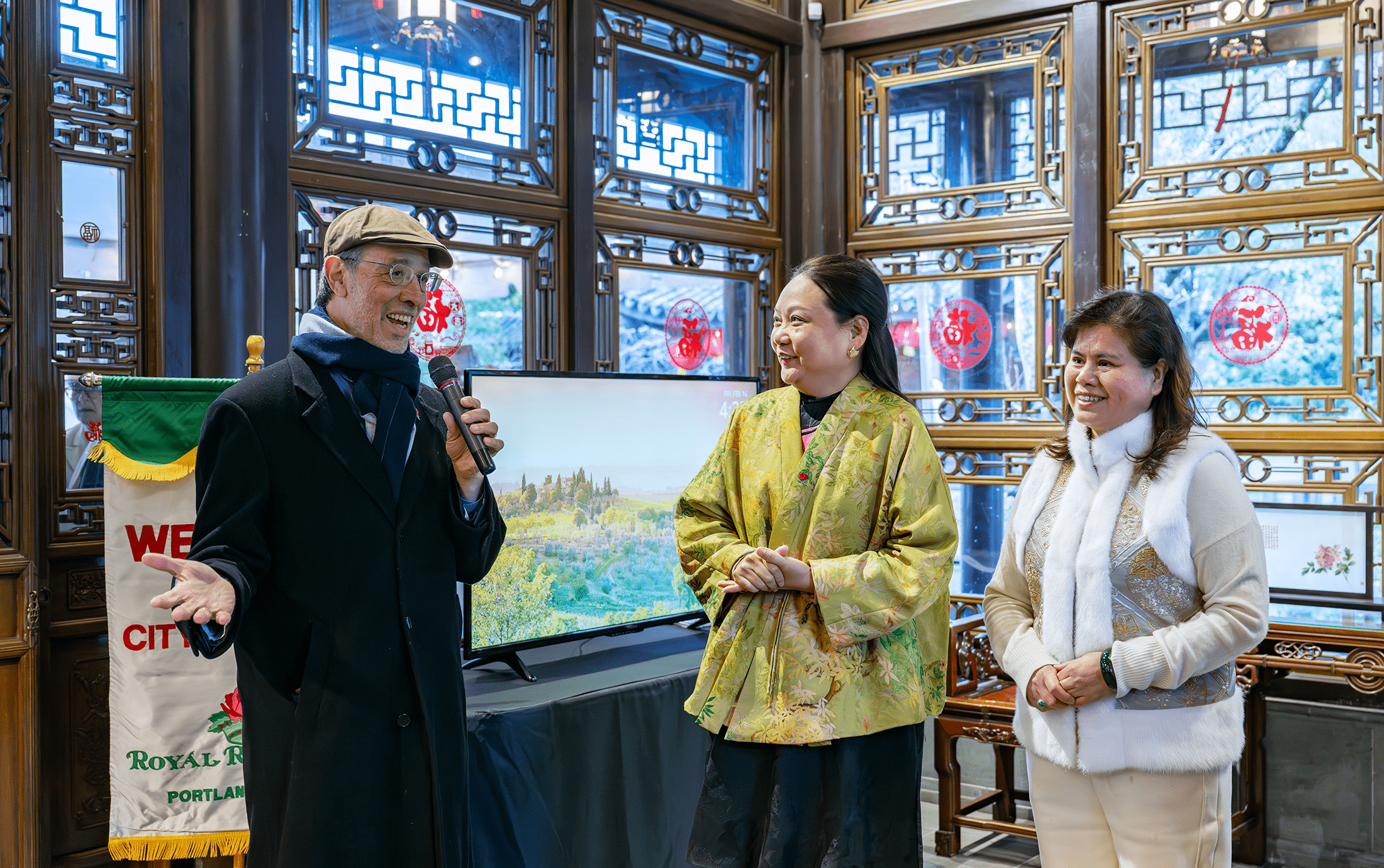 俄勒岡州參議員邁克爾 德蒙布羅,麥魯瑪縣議員雪倫 麥倫等本地政要;蘇州廣播電視總台融媒新聞中心採製部責編陳軍,蘇州中國工藝美術大師、國家級非遺傳承人鄒英姿,江蘇省工藝美術大師、非遺傳承人周海雲,鄒英姿刺繡藝術有限公司執行董事郭子舟等蘇州代表團成員;俄勒岡中國理事會執行主席藍進、副主席應書琪;蘭蘇園園長伊麗莎白 奈、副園長白旭東以及各界嘉賓出席了開幕典禮,波特蘭玫瑰使團以傳統禮儀迎接了來自蘇州的朋友們。