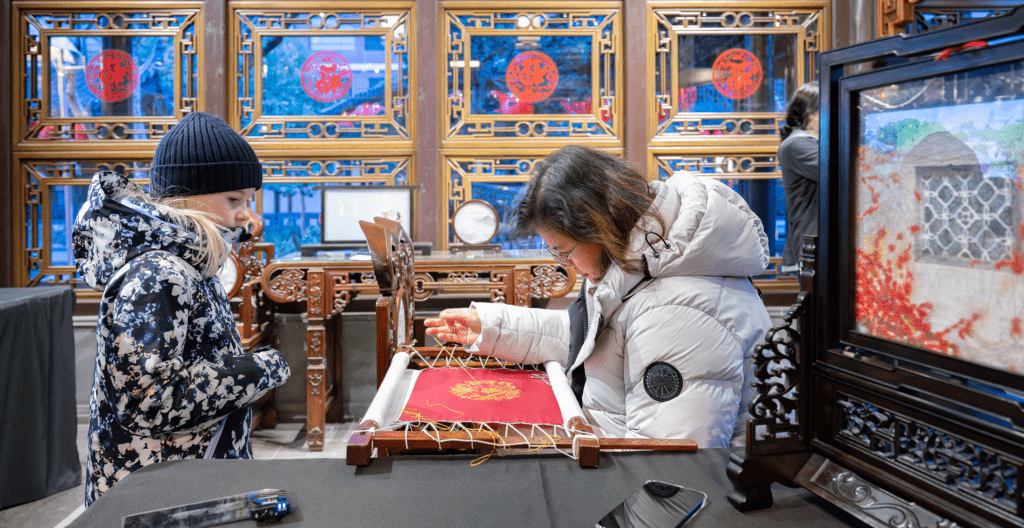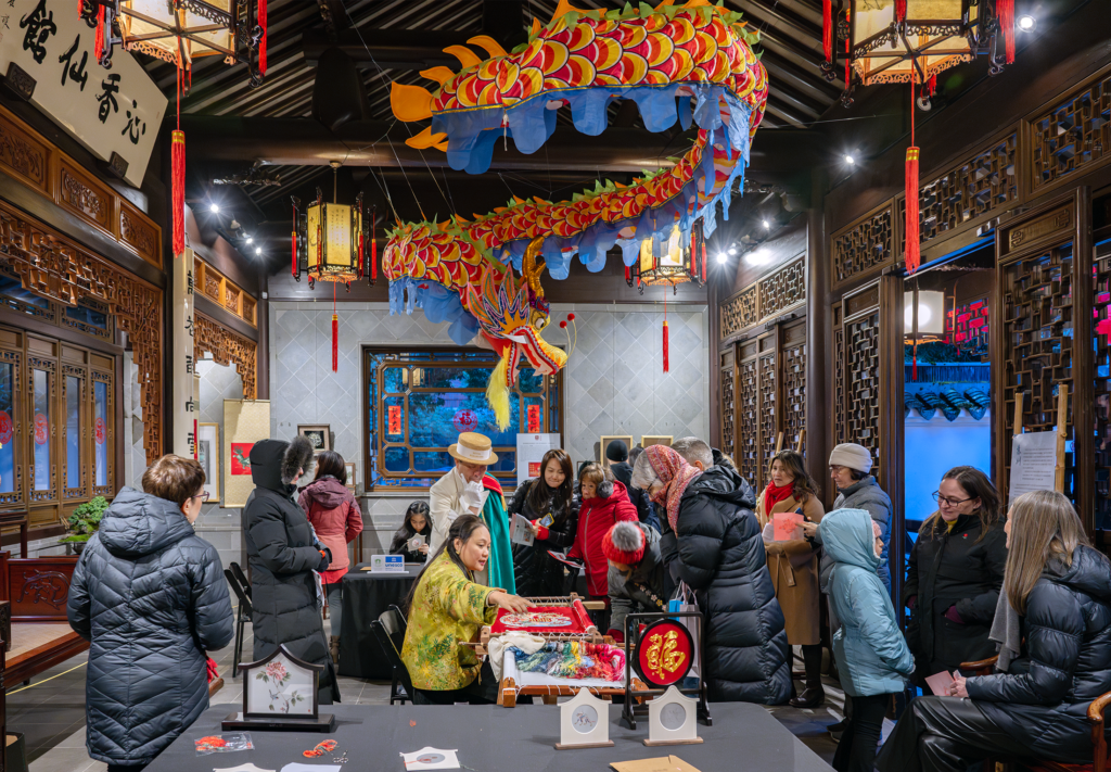 中國工藝美術大師鄒英姿,江蘇省工藝美術大師周海雲,兩位藝術家的現場蘇繡表演以及郭子舟年畫展示,讓民眾了解到蘇州的非遺之美,與遊客們的親密互動體驗更加烘托出喜慶祥和的春節氛圍。