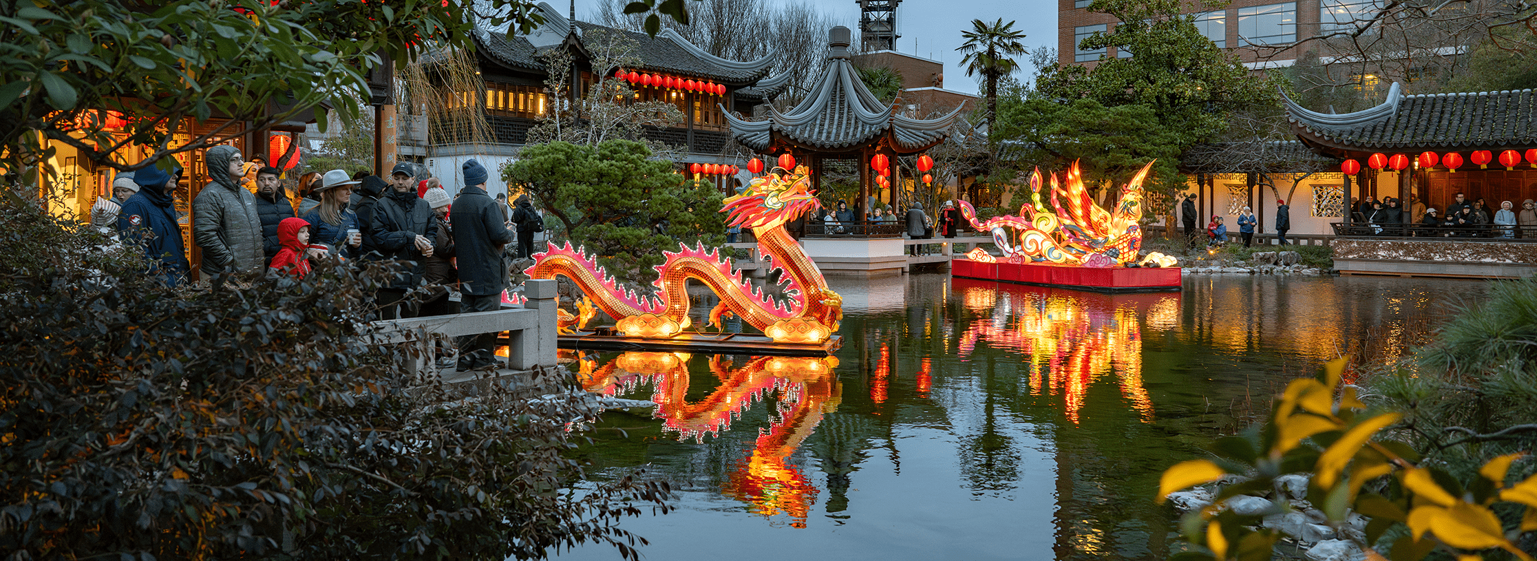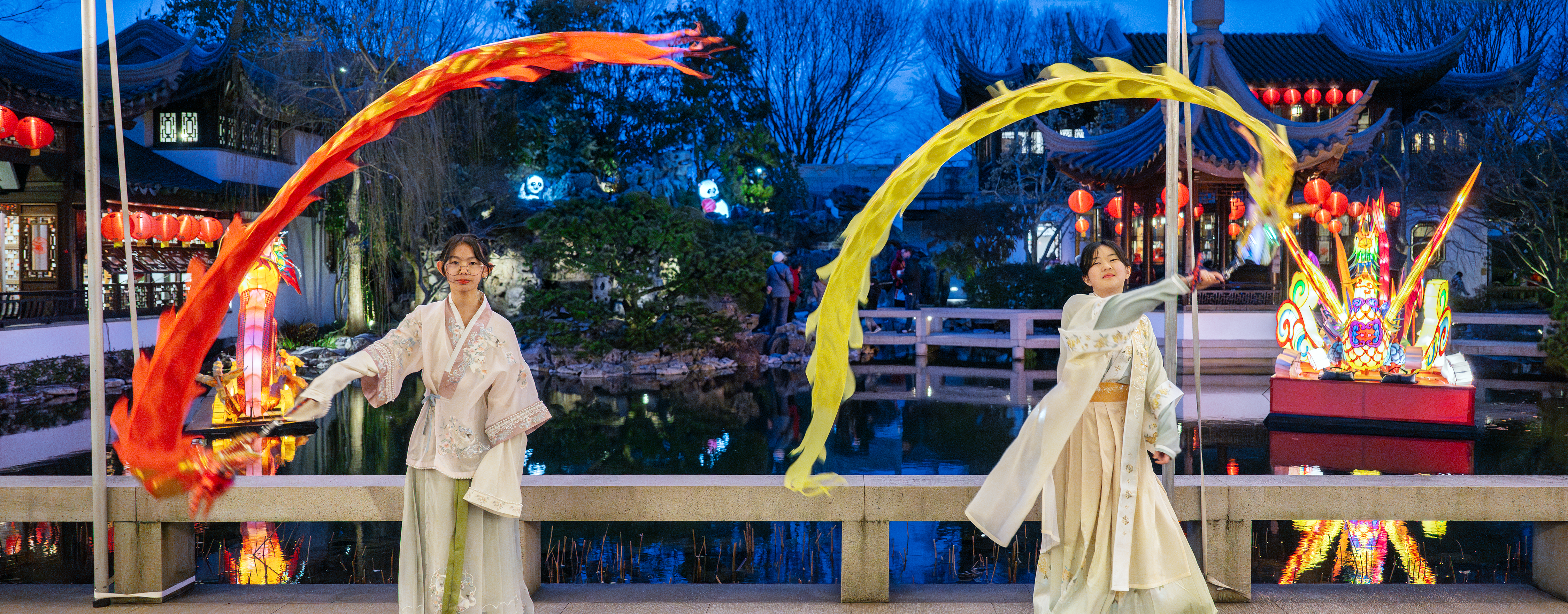新春佳節期間的蘭蘇園內裝扮一新,一串串大紅燈籠懸掛於樓閣與庭廊,一件件標新立異的彩燈座落於庭院之內,寓意龍鳳呈祥的大型彩燈浮於湖面,金色的倒影隨波蕩漾,引得數百名遊客夜幕下駐足觀賞,感受中國傳統春節文化。