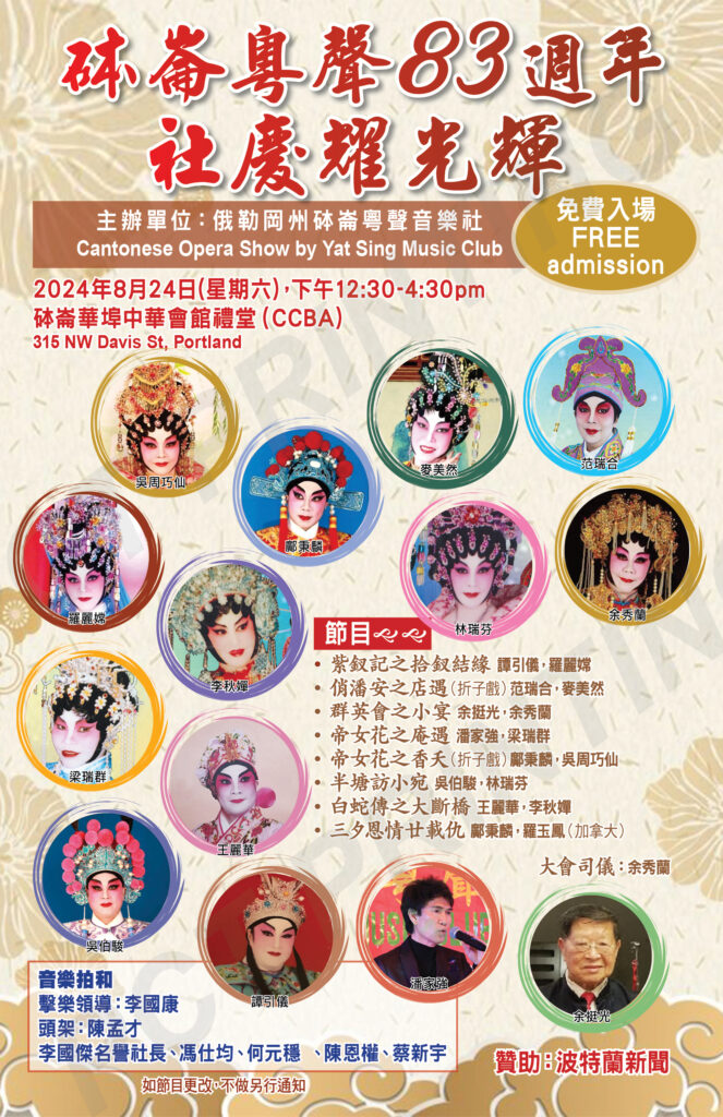 (本報訊)為了慶祝成立83週年,同時回應廣大戲迷的熱情要求,砵崙粵聲音樂社將於2024年8月24日星期六下午12:30至4:30在俄勒岡中華會館舉辦「砵崙粵聲音83週年社慶耀光輝」粵劇演出。此次演出旨在推廣粵曲和粵劇文化,面向公眾免費開放,誠邀市民前來看戲。