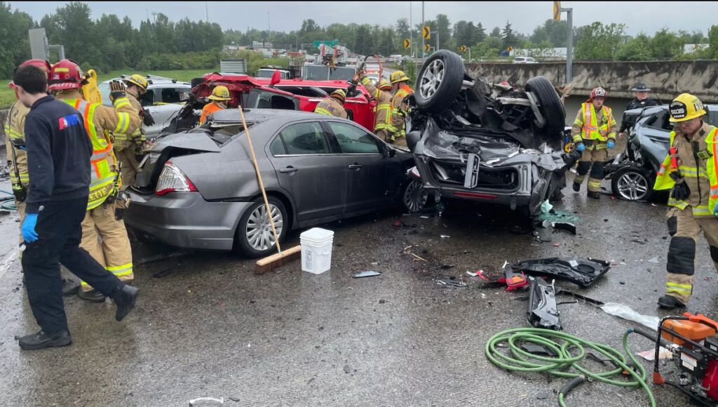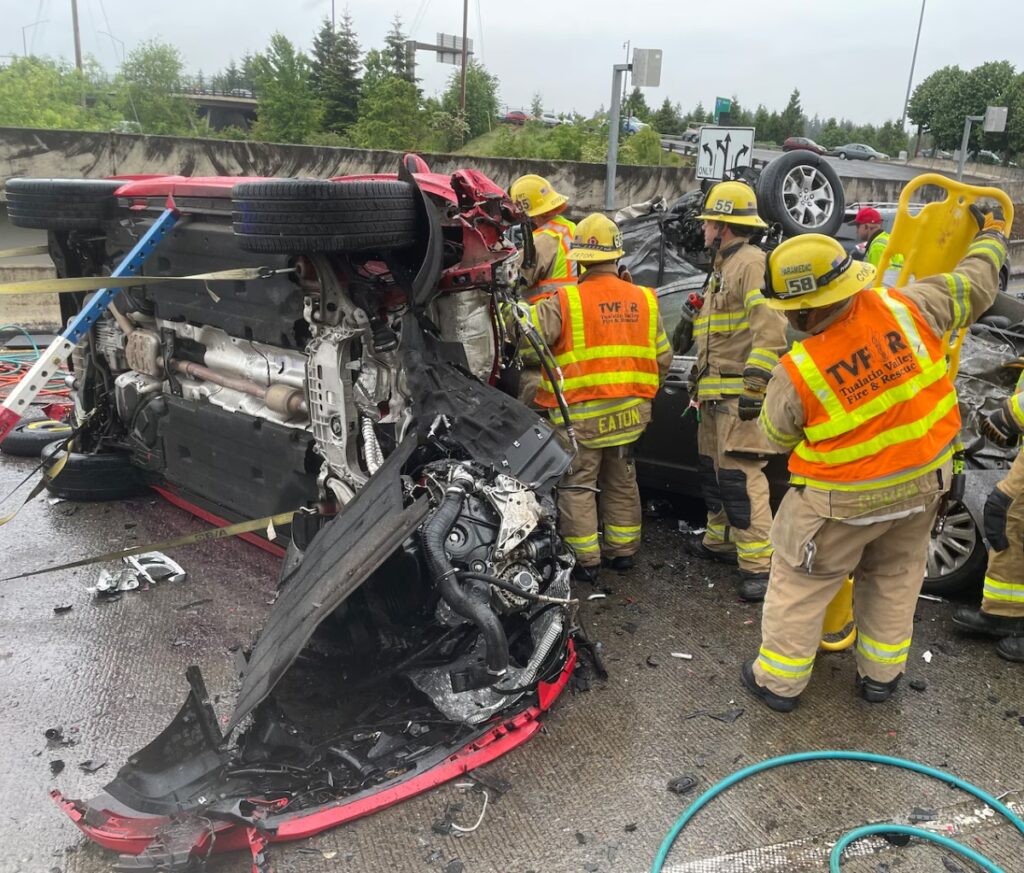 當日大約下午4點,消防局接到報告稱,在北向的I-5州際公路Nyberg街出口有一輛車翻覆並且司機被困。當Tualatin警方抵達現場時,他們向消防隊員報告說,多輛車先後相撞,另有一人被困在一輛側翻的車內。消防局救援人員通過使用支柱和支撐裝置對車輛進行了穩定,將兩人從撞毀的車輛中救出。二人目前都傷情嚴重,被送往醫院。
