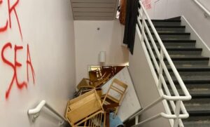 抗議者將桌椅仍在樓梯入口處以阻塞通道